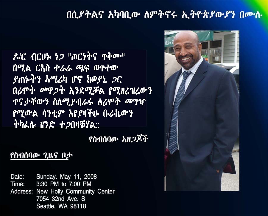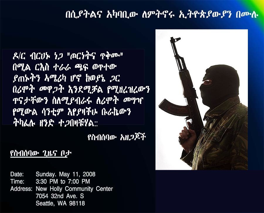 ከሺህ ቃላት አንድ ስዕል ወይንም ፎቶ ይናገራል እንዲሉ፤ እኔ ብዙ ለማስረዳት ከምጥር ለዛሬ ሦስት ፎቶግራፎችን ወይንም ፖስተሮችን መርጬልሃለሁ። ዶ/ር ብርሃኑ ባሳለፍነው እሁድ በሲያትል ከህዝብ ጋር ተወያይቶ ነበር። ያንን አስመልክቶ በተላለፈ ጥሪ የተሰራጨውን ፖስተር ተመርኩዘው የዋርካ ታዳሚዎች “የፈጠራ ችሎታቸውን” እና የመናገር፣ የመፃፍ፣ የማሾፍ፣ የማላገጥ፣ የመቦጨቅ፣ የመፈተል፣ … መብቶቻቸው እስከምን ድረስ እንደሆነ ፖስተሮቹ ይገልጡልሃል ብዬ አምናለሁ። ፖስተር አንድን የለጠፈው መረዋ ሲሆን፣ ፖስተር ሁለትንና ሦስትን ደግሞ ‘ቀንዱ’ የተሰኘው ባለቅጽል ስም ነው። በፖስተሮቹ ላይ ያሉትን የጽሑፍና የምሎቹን ልዩነቶች በደንብ ልብ ብለህ እያቸውና ልዩነታቸውን ፈልግ። (ፖስተሮቹ የወጡበትን ገጽ እዚህ ስትጫን ታገኘዋለህ) ለማንኛውም ሄይዶ! (ሠላም ሁን! - በስዊድን አፍ) የሣምንት ሰዎች ይበለን! - አሜን!!!